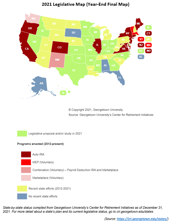 As of December 31, 2021, 14 states and two cities (though NY City’s program is expected to be merged with the NY state program and Seattle’s is on hold indefinitely pending state legislative action) have passed laws requiring private-sector employees to participate in their state retirement program unless they offer a retirement plan for their employees; more states have proposed such legislation.