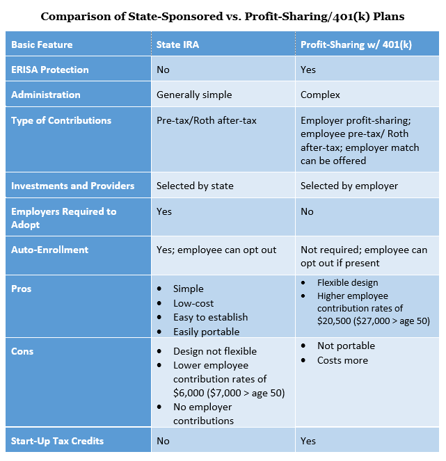 A feature to highlight is that the employer can save for his own retirement with a profit-sharing plan, something he can’t do under a state-sponsored plan. Employees are better off as well, with employer profit-sharing contributions that wouldn’t be possible under a state plan, plus employee contributions with higher limits if there’s a 401(k) feature.
