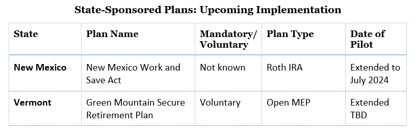 It’s important to remember that these plans are only mandatory to the extent the employer doesn’t have a profit-sharing or other type of qualified plan, which exempts an employer from participating in the state plan. That’s good, since the state plan may not be best for the best fit for the employers or employees.