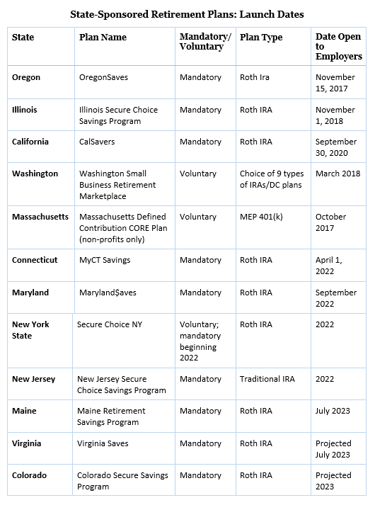 Tables 1, 2, and 3 show the states who have or are going to have state-sponsored retirement programs, and where they are in their implementation, generally phased in in waves.
