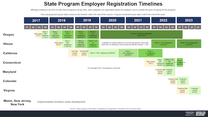 As of April 1, 2022, six of the 14 states are open to companies enrolling their employees in their plans – Oregon, Illinois, California, and Connecticut (mandatory plans) and Massachusetts and Washington (voluntary plans). The remaining states are being phased in in waves (Table 1).